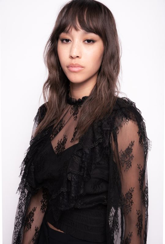 bluză decupată din dantelă cu model floral și volan. mâneci lungi cu manșetă cu volan și bandă cu fumuri în partea de jos. închidere centrală mică, împodobită cu nasturi, la spate.