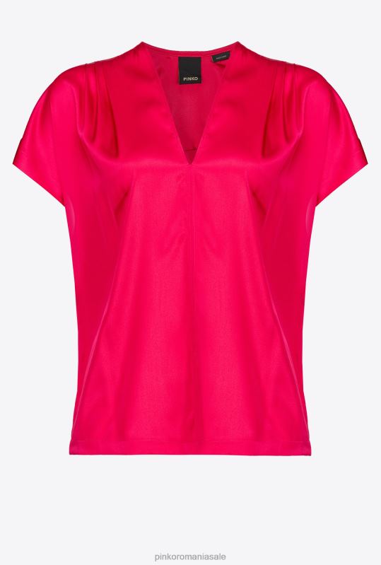 bluză fluidă din satin de mătase elastic. cu decolteu în V, mâneci tip șapcă și culegere pe umeri.