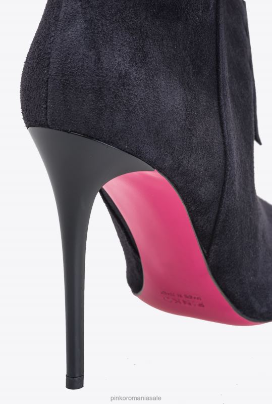 Botine din piele intoarsa moale, cu design tubular confortabil, franjuri decorative in stil cowboy si logo pinko mic in relief in partea de sus. varf conic si talpa din piele cu toc stiletto de 10 cm. branț căptușit și căptușeală din microfibră respirabilă.
