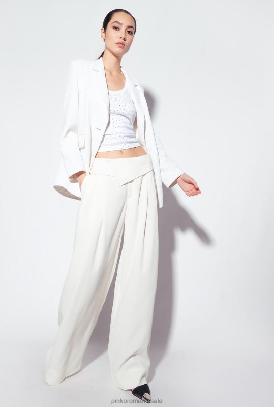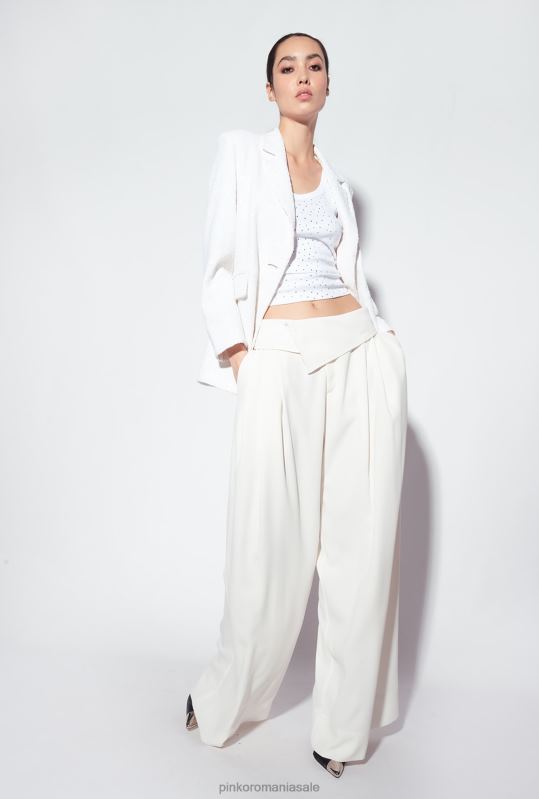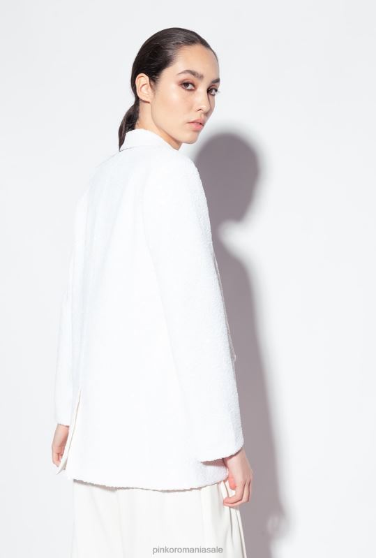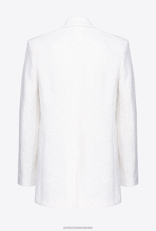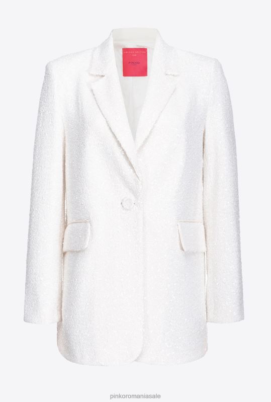 Blazer ușor supradimensionat, drept, în stil boyfriend, din țesătură albă brodata cu paiete, cu un efect deosebit de strălucitor. Guler cu rever, umeri construiti, mâneci largi, buzunare laterale împodobite cu clape și un aerisire central în spate. interior căptușit cu material textil și închidere cu un singur buton. Îmbrăcămintea face parte din colecția capsulă specială în ediție limitată, care cuprinde modele exclusiv pinko galleria în ediție limitată.