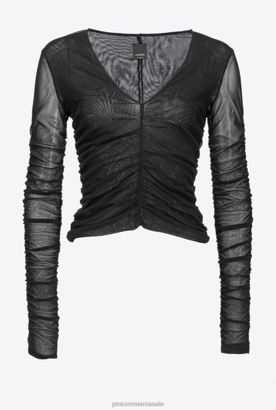 pulover cu mâneci lungi, cu decolteu în V, din țesătură de tul elastic semitransparentă, cu detaliu drapat pe toată suprafața.